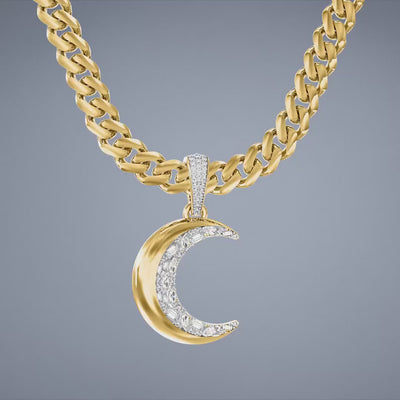 The Monaco Chain™ Charm 20 half-studded crescent moon charm blends contrast and dimension with a dual-tone crescent: one side is polished gold, the other is adorned with round- and baguette-cut zirconia stones, creating the illusion of a gold crescent hugging a Swarovski®-studded moon.