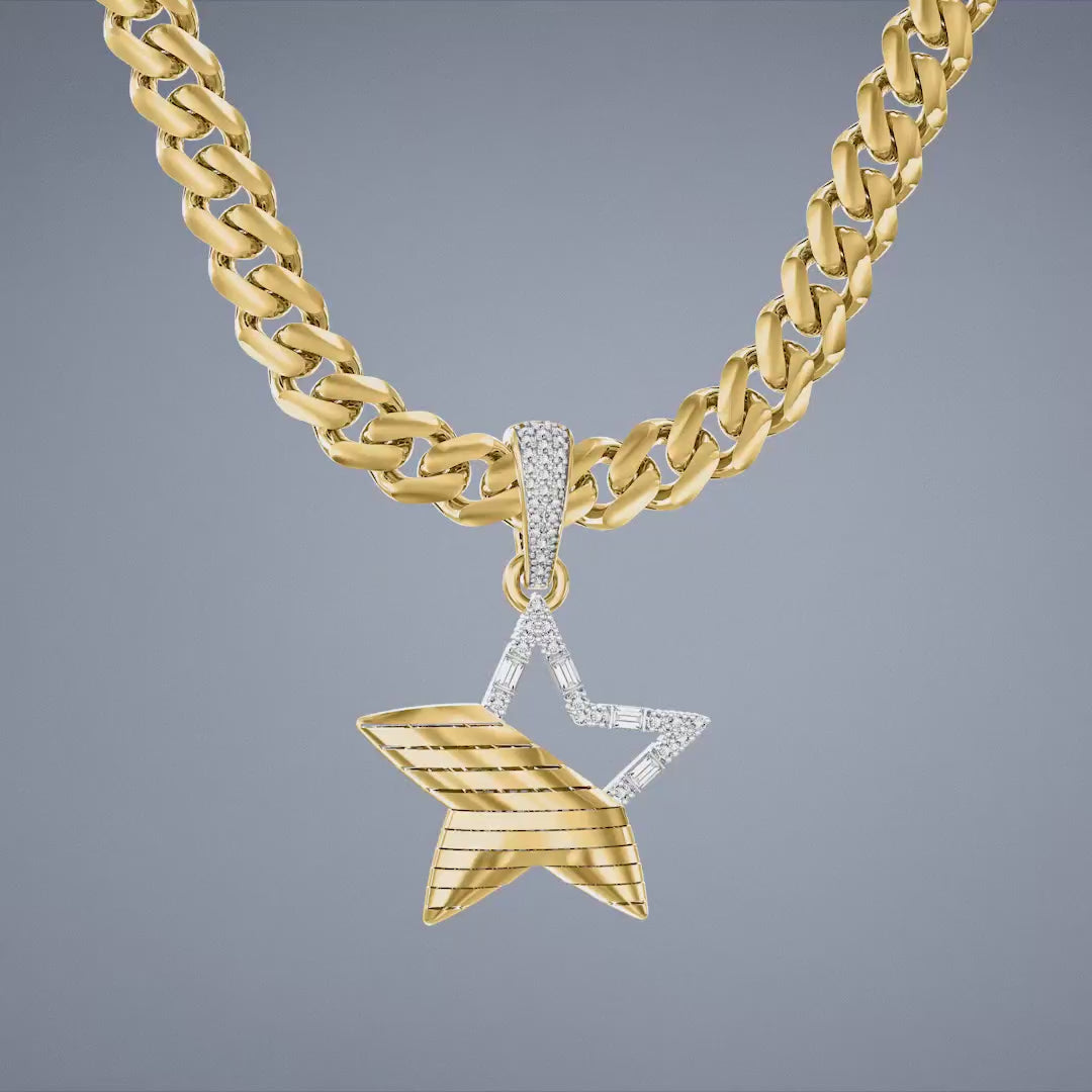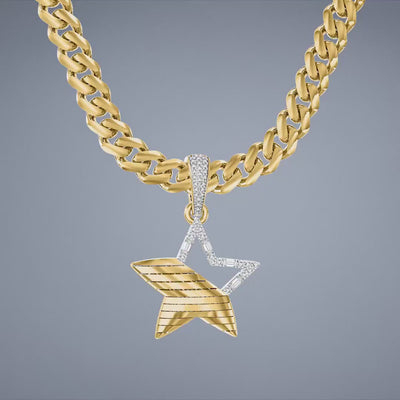 This two-tone geometric star charm stands out with its asymmetric design: three star points in striped gold texture and two star points outlined in baguette- and round-cut zirconia stones. A bold, contemporary star charm pendant that makes a statement in any Monaco Chain™ collection.